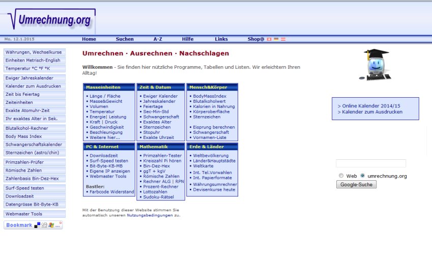 Wir haben mit der Arbeit am neuen Design begonnen. Deshalb hier ein letzter Schnappschuss des alten Kleides von Umrechnung.org. Dieses war seit unserer Gründung im Jahr 2005 online, ist also mit 10 Jahren fast schon ein Dinosaurier in der schnellen Online-Welt.